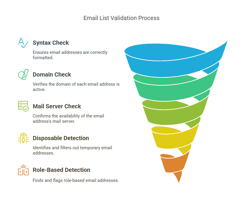 Reoon Email Verifier works by checking the validity of email addresses in your list. It performs several checks, including: